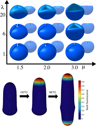Dans une autre étude, nous avons modélisé la croissance et la division de la levure de fission. La forme de la levure de fission est en première approximation un cylindre avec deux hémisphères aux extrémités. Sa croissance a lieu aux extrémités uniquement. Nous disposions de distributions de protéines fluorescents localisés à l'apex. En modélisant le paroi cellulaire par une coque axisymmétrique nous avons réussi à déterminer laquelle de ces protéines est la plus limitante pour la croissance. A l'aide du même modèle nous avons relié la taille de la cicatrice de division à des propriétés mécaniques du septum avant la division.